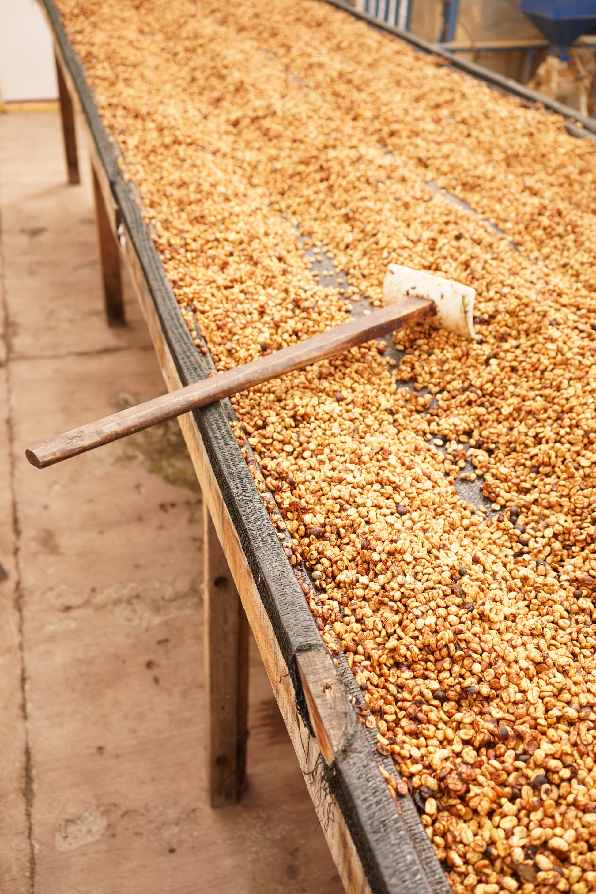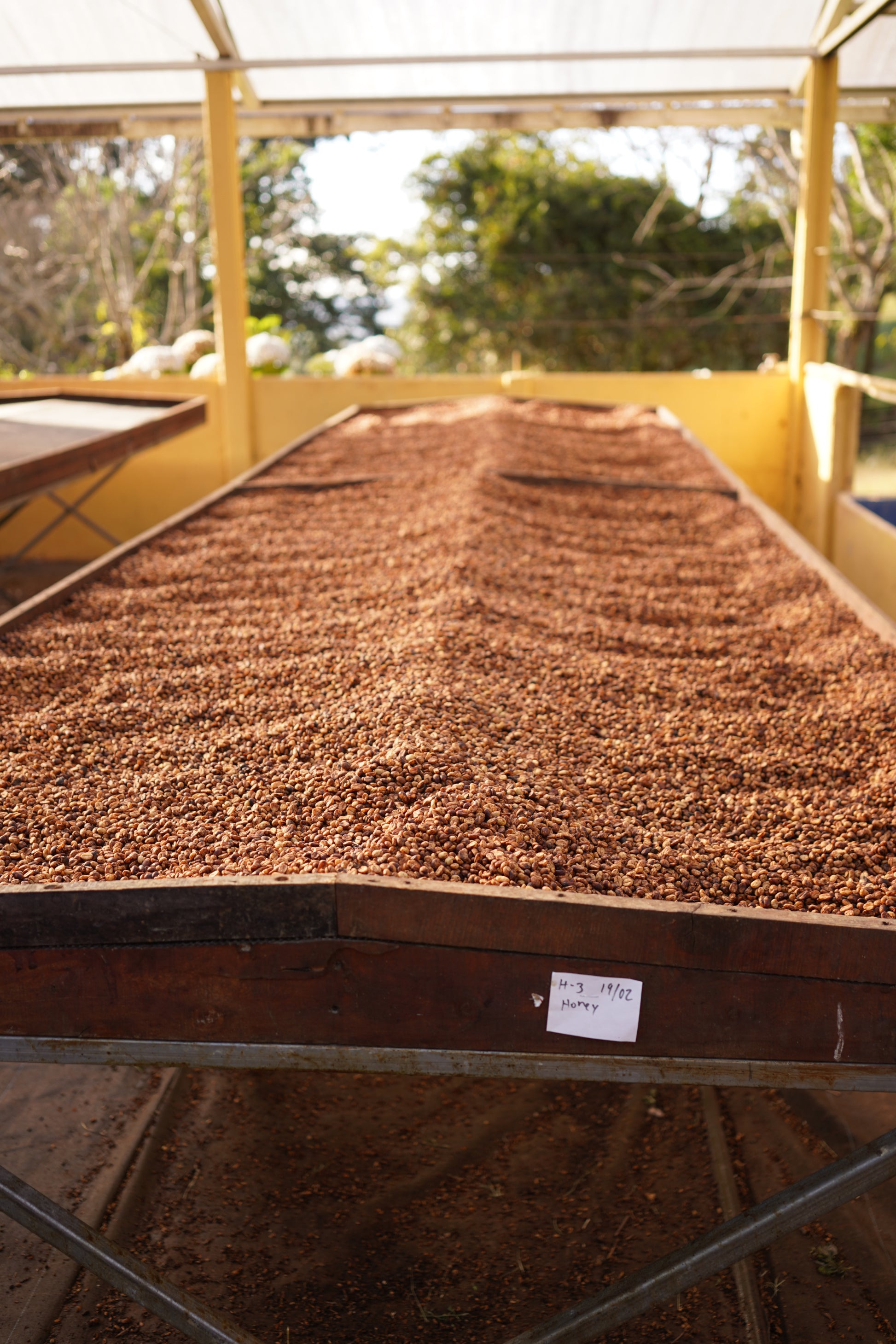 Honey: Ripe cherries were collected and delivered to the milling station the same day. Cherries passed through water floatation for primary selection. Depulped with partial mucilage removal. Dried on covered raised beds. with frequent turning and hand sorting over 3 weeks. |